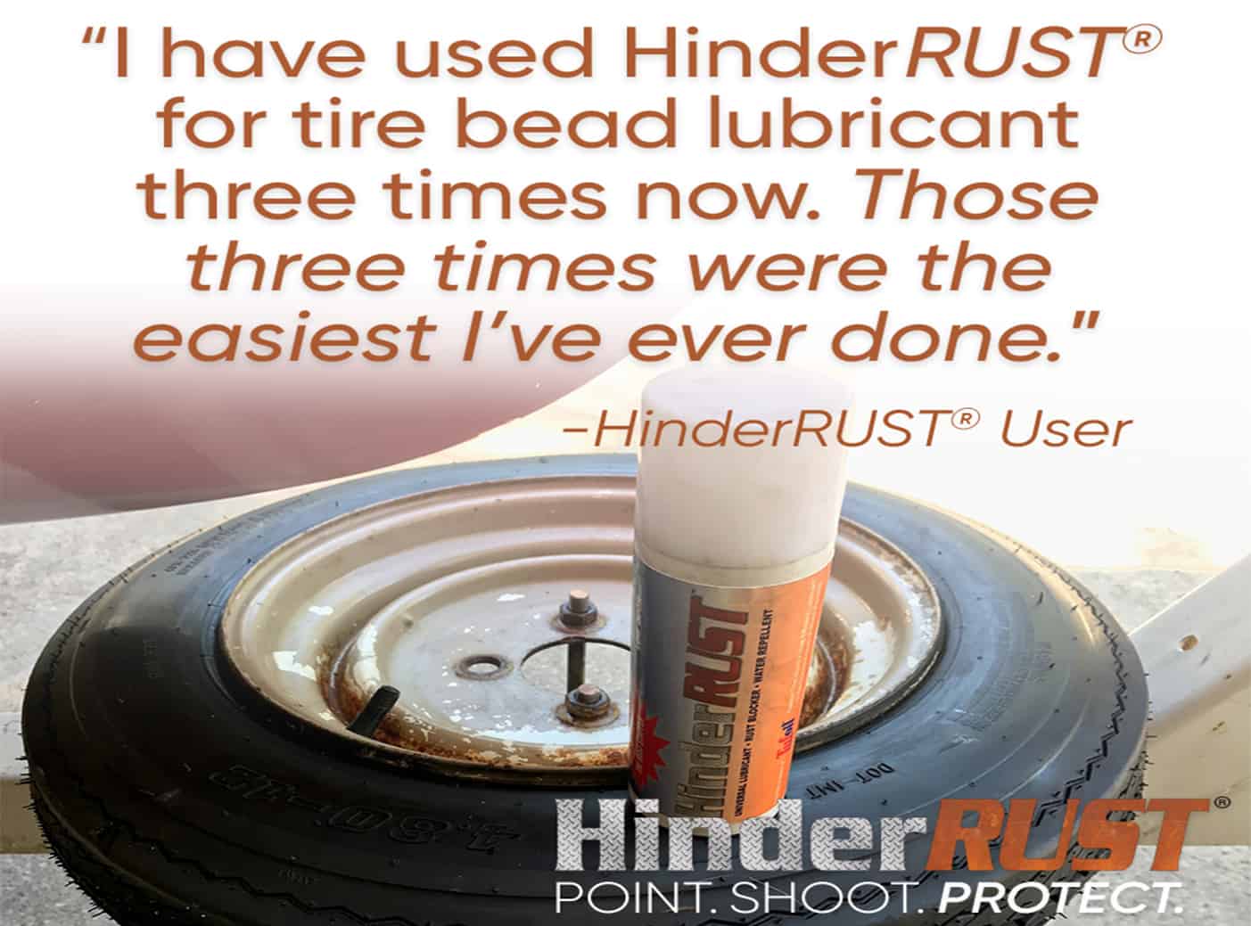 “I have used HinderRUST for tire bead lubricant 3 times now, although not a scientific test, those 3 times were the easiest I have ever done. I also treated the entire inside of the rim to prevent rust. I think there could be a market for this at professional tire shops. Almost all new vehicles use aluminum rims, it is very common for corrosion to develop under the bead and cause a leak. If HinderRUST is used to treat the rim and as a bead lubricant, there would be no more corrosion. I’m in need of new tires on my truck and I’m going to have the shop use HinderRUST to mount them to see how it works.”